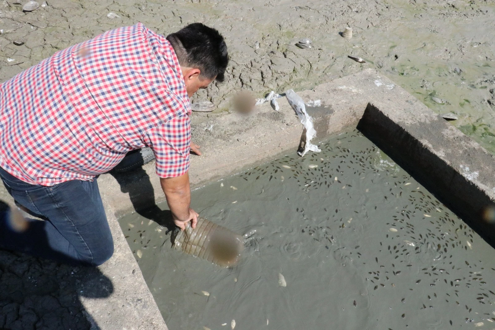 Gölette suyun azalmasıyla balıklar balçık içerisinde kaldı. Bunun üzerine köylüler balıkları sulak alana taşımaya çalışıyor.