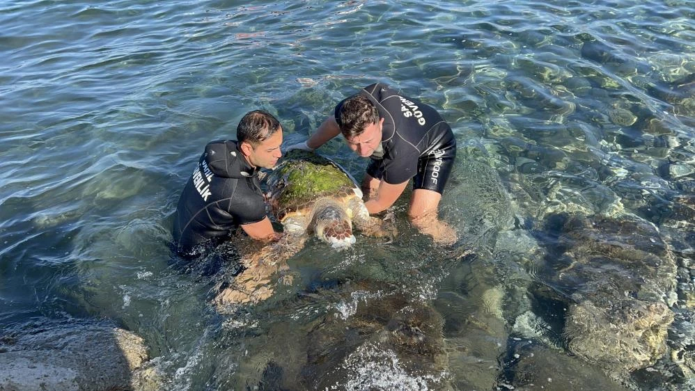 Dalgıçların yardımı ile kıyıya çıkarılan caretta caretta, incelenmesi için Doğa Koruma ve Milli Parklar Müdürlüğü görevlilerine teslim etti.