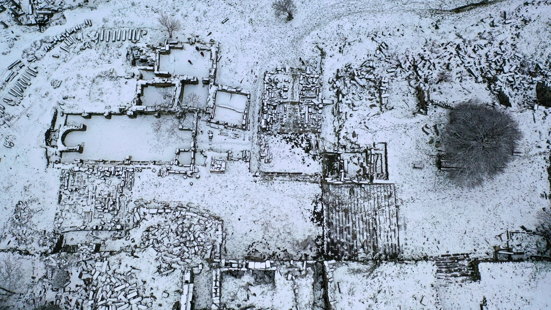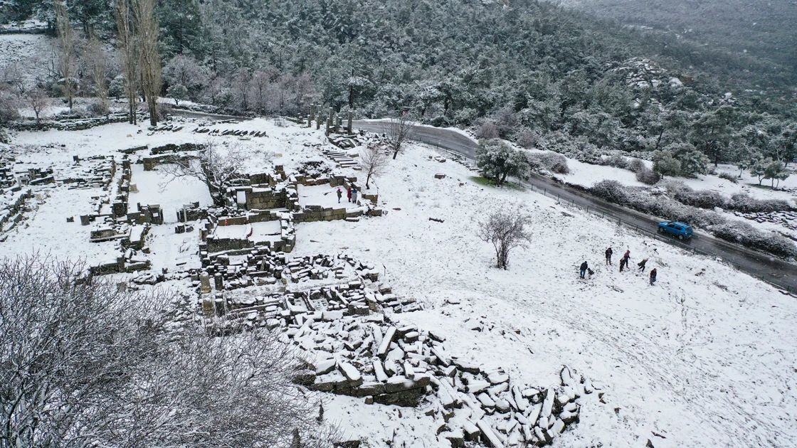 Milas ilçesinde de yıllar sonra kar yağması nedeniyle Labranda Antik Kenti beyaza büründü.