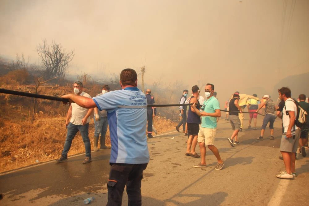 Yangına Orman ve itfaiye ekipleri ile Polis ve Jandarma TOMA’ları su sıkarken, beton mikserleri ve köylüler bölgeye su taşıyor.
