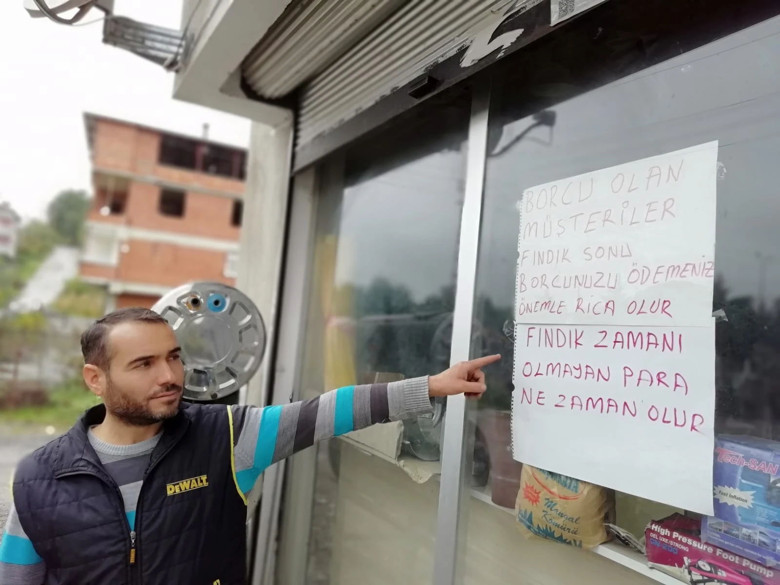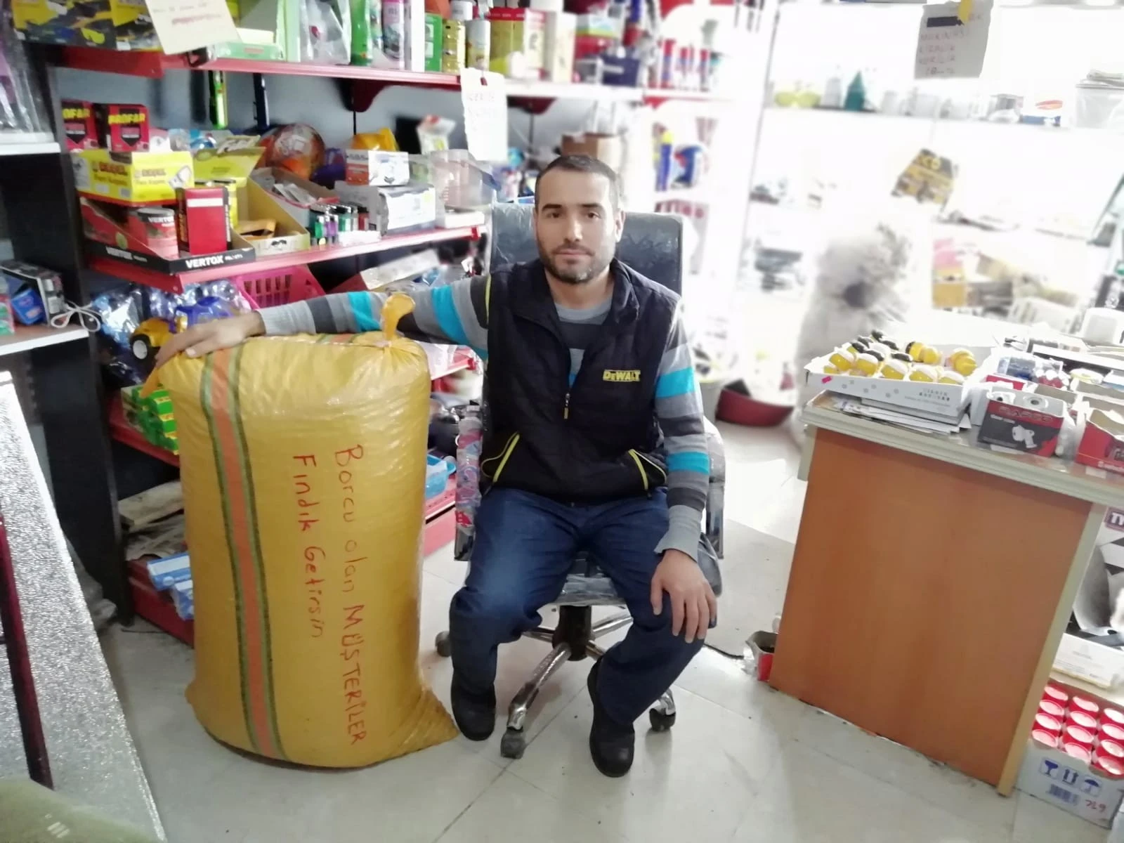 İlçenin Fatih Mahallesi'nde hırdavat işi yapan 3 çocuk babası Ersin Yılmaz, mahallede her ailenin fındığı olduğundan borçlularından para yerine fındık getirmesini istiyor. Yaklaşık 2 yıldır borçlularından paralarını alamadığını ifade eden Yılmaz, iş yerinin camına astığı yazıyla görenleri hayrete düşürdü.