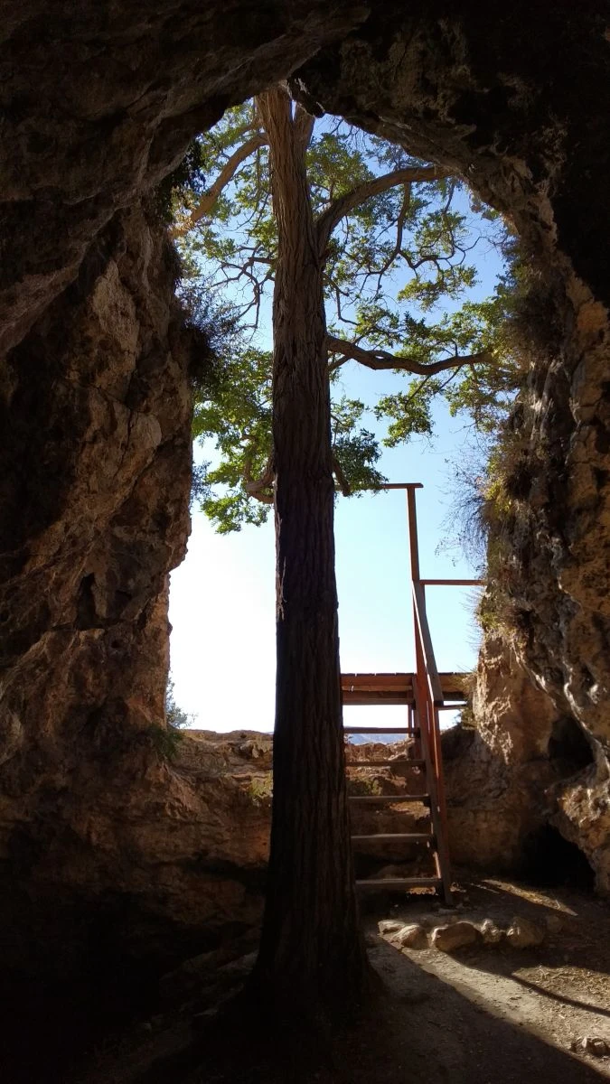 Mağaranın hemen çıkış kısmında kökleri mağarada bulunan dalları ise kaleye uzanan ağaç dikkat çekiyor. Kalenin ziyaretçileri ilk olarak bu ağaçla karşılaşıyor. Dışarıdan bakıldığında ise ağacın yaprakları kaleden mağaraya olan girişi kamufle ediyor.