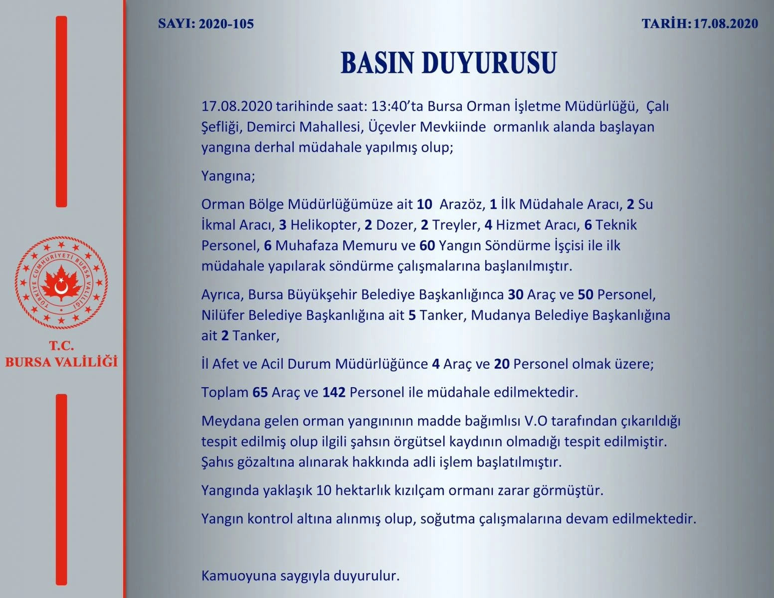 "17.08.2020 tarihinde saat 13.40’ta Bursa Orman İşletme Müdürlüğü, Çalı Şefliği, Demirci Mahallesi, Üçevler mevkiinde ormanlık alanda başlayan yangına derhal müdahale yapılmış olup, yangına; Orman Bölge Müdürlüğümüze ait 10 arazöz, 1 ilk müdahale aracı, 2 su ikmal aracı, 3 helikopter, 2 dozer, 2 treyler, 4 hizmet aracı, 6 teknik personel, 6 muhafaza memuru ve 60 yangın söndürme işçisi ile ilk müdahale yapılarak söndürme çalışmalarına başlanılmıştır.