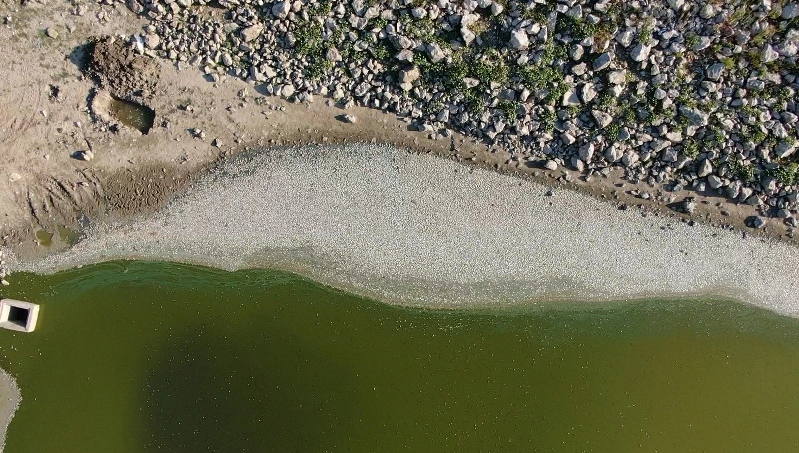 Bursa’nın Mudanya ilçesi Ülkü Mahallesi’nde bulunan ve çevredeki diğer mahallelerin de sulama için kullandığı gölet çok büyük ölçüde kurudu. Az miktarda kalan suyun seviyesinden ve oksijen yetersizliğinden kaynaklı binlerce balık kıyıya vurmaya devam ediyor.