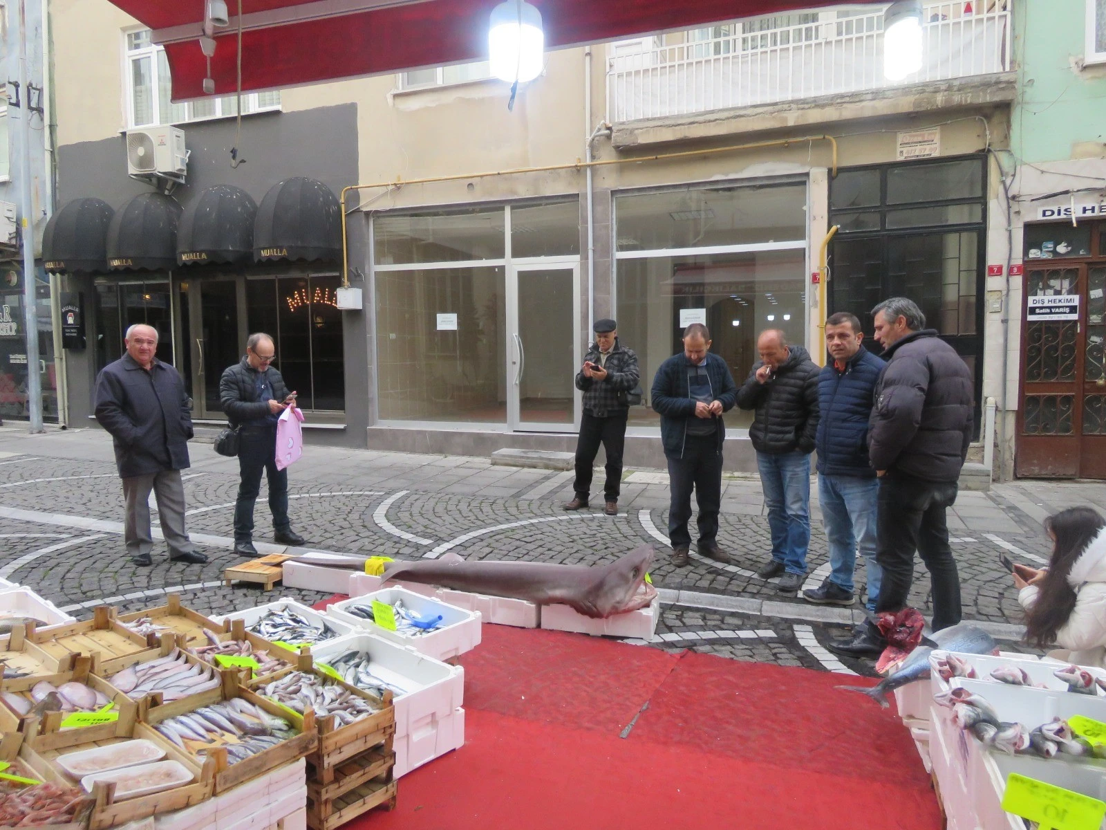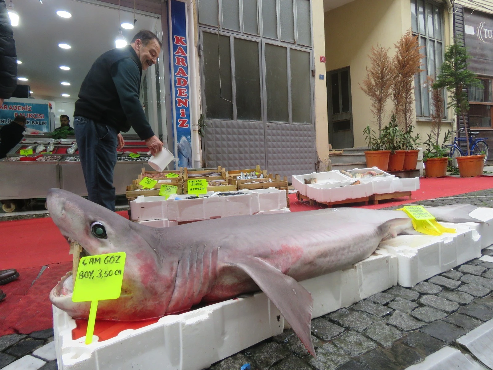 Yaklaşık 3.5 metre uzunluğundaki dev köpekbalığını gören vatandaşlar şaşkınlığını gizleyemezken, Küçük, her yıl balıkçı ağlarına köpekbalığı takıldıkça tezgahında sergilediğini söyledi.