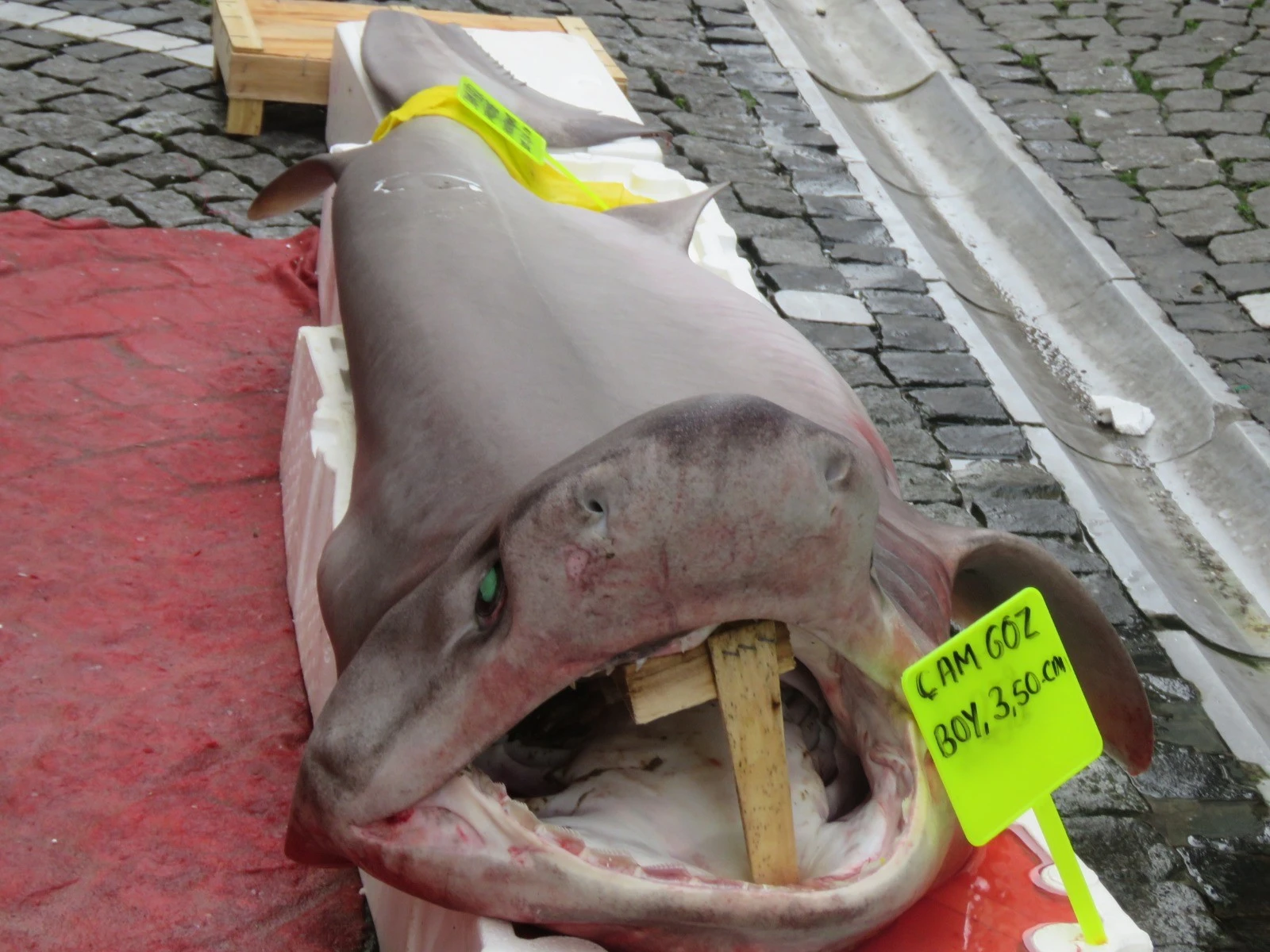 Lüleburgaz’da yaşayan balıkçı Sami Küçük, Tekirdağ’ın Şarköy ilçesi açıklarında yakalanan 3.5 metre uzunluğunda, 120 kilogram ağırlığındaki camgöz cinsi köpekbalığını balık tezgahında sergiledi.