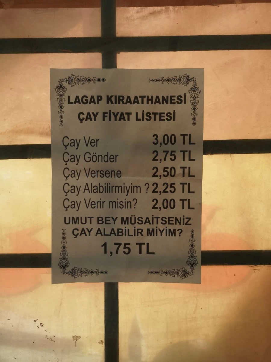 Mersin’in Tarsus ilçesine bağlı Şehitkerim Mahallesi’nde bulunan Kırkkaşık Bedesteninde çay ocağı işleten Umut Lagap, müşterilerinin kendisine yaptığı hitaba göre çay ücreti alıyor. Çay ocağında fiyatlar 'Çay Ver 3,00 TL', 'Çay Gönder 2,75 TL', 'Çay Versene 2,50 TL', 'Çay Alabilir miyim? 2,25 TL', 'Çay Verir misin? 2,00 TL' ve 'Umut bey müsaitseniz çay alabilir miyim? 1,75 TL' olarak alınıyor.