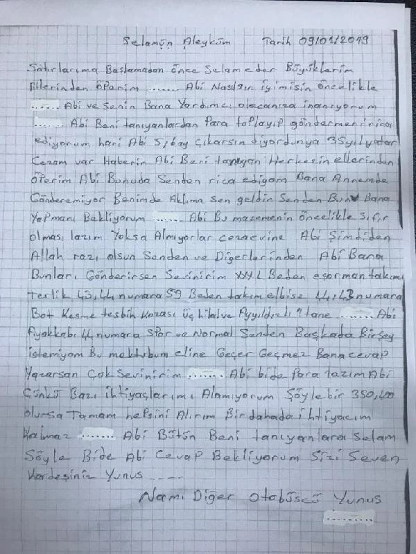 "Beni tanıyan herkesin ellerinden öperim. Senden ricam bana annem de para göndermiyor. Benim de aklıma sen geldin. Senden bunu bana yapmanı bekliyorum, bu malzemenin öncelikle sıfır olması lazım. Yoksa cezaevine almıyorlar. Ağabey şimdiden Allah senden ve diğer ağabeylerden razı olsun. Bana bunları gönderirsen sevinirim; XXXL beden eşofman takımı, 43-44 numara terlik, 59 beden takım elbise, 43-44 numara bot, üç hilalli ve ay yıldızlı tespih, 44 numara normal ve spor ayakkabı. Başka da bir şey istemiyorum. Bu mektup eline geçer geçmez cevap yazarsan sevinirim. Bir de para lazım. İhtiyaçlarımı alamıyorum. Şöyle 350-400 TL olursa tamam. Bütün ihtiyaçlarımı alırım. Bir daha da ihtiyacım kalmaz. Ağabey beni bütün tanıyanlara selam söyle. Sizden cevap bekliyorum. Sizi seven kardeşiniz Yunus, namıdiğer otobüsçü Yunus."