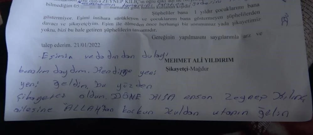 Yazdığı notta eşinin vefatından sonra bunalıma girdiğini belirten Yıldırım notta, “Kendime yeni geldim. Bu yüzden yeni şikayetçi oldum. Eşimin babaannesi en son eşimin ailesine ‘Allahtan korkun gelin bu yuvayı yıkmayın’ demişti” ifadelerine yer verdi.