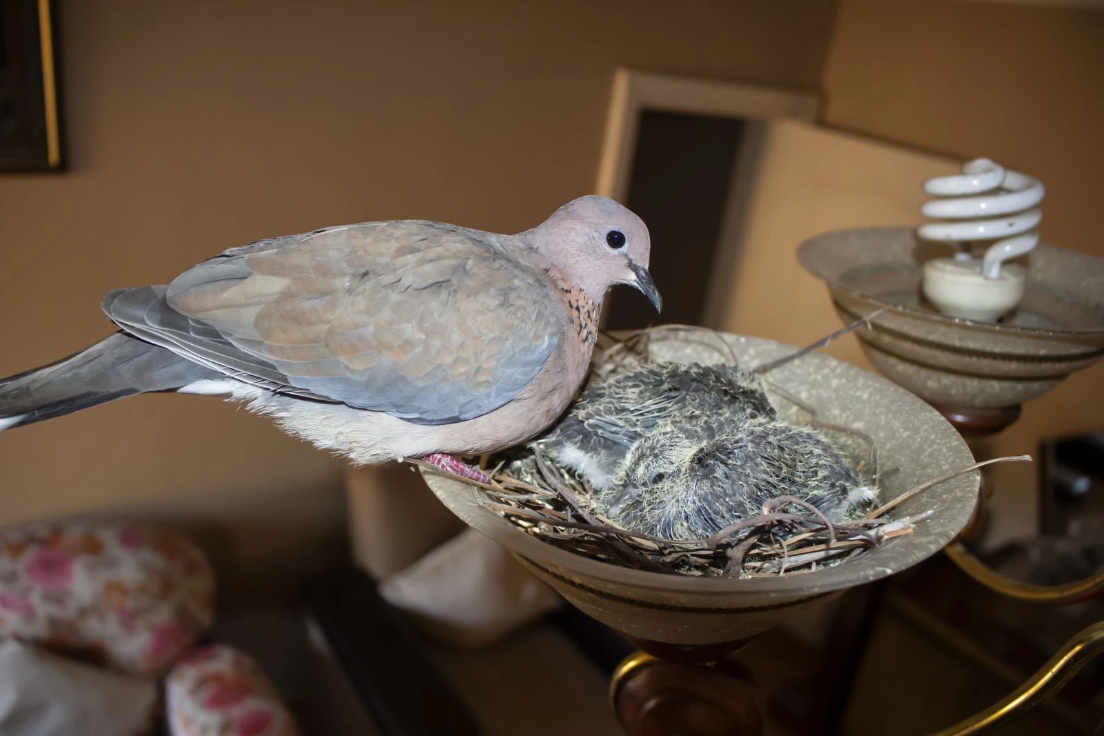 Yaklaşık bir ay önce oturma odasının penceresinden içeri giren kuşlar, 3 gün içerisinde avizenin içine yuva yapmayı başardı. Dışarıda bulduğu küçük dal parçalarını avizenin içine taşıyarak yuvasını yapan kuşlar, yuvayı yaptıktan sonra yumurtlayıp kuluçkaya yattı. Bir ay zarfında dünyaya 2 yavru kuş geldi. Kuşlar hala avizenin içerisinde yaşıyor.