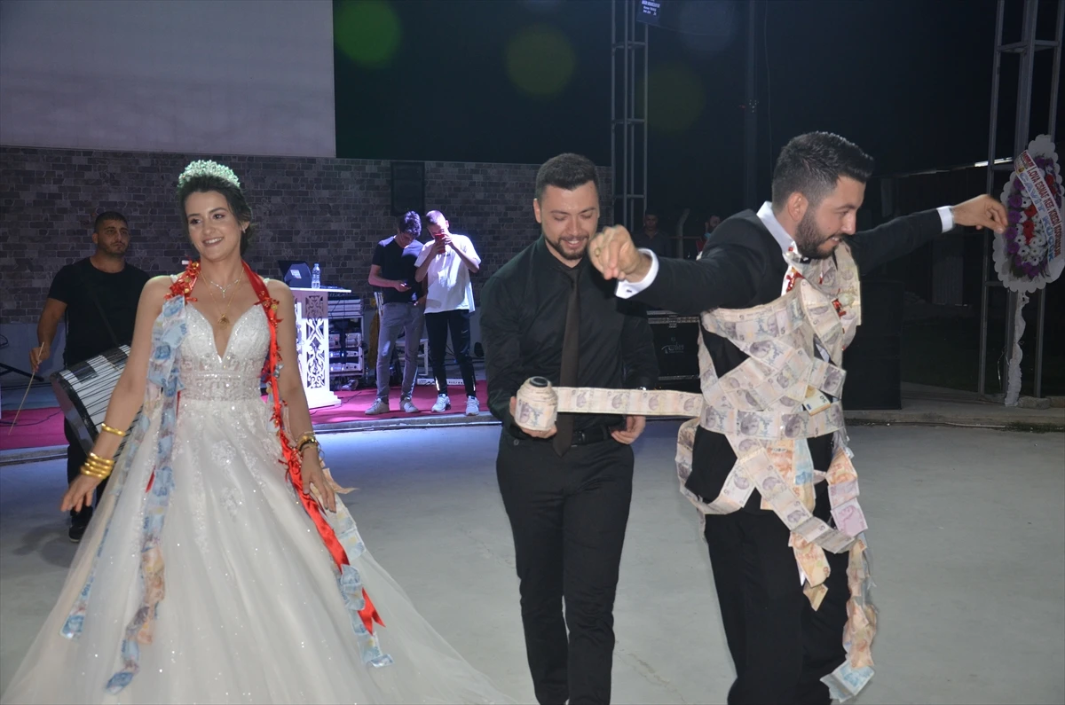 Aydın’ın İncirliova ilçesinde belediyede çalışan Necati Kaman ile Tuğçe Cengiz, kır bahçesinde düzenlenen törenle dünyaevine girdi. Damadın arkadaşları Şahin Madan ve Cihan Eroğlu, takı merasimi sırasında iğnelerle tutturdukları 5 liralık banknotları düğün hediyesi yaptı. İki arkadaş, uzunluğu 60 metreyi bulan ve toplam değeri 1800 lira olan banknotları damadın vücuduna doladı.