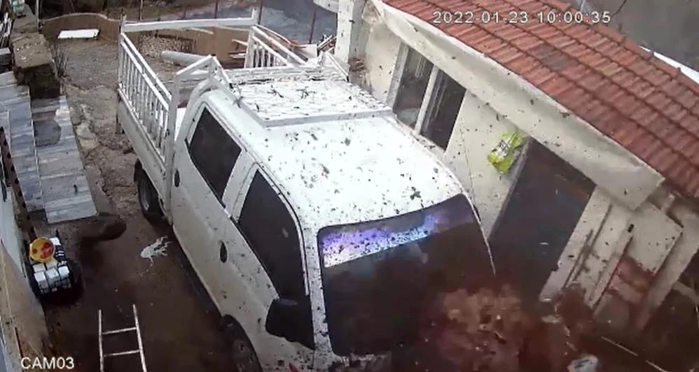 Kayanın eve düşme anı güvenlik kamerasına yansırken, 4 kişilik Çetinkaya ailesi şans eseri hayatta kaldı. Güvenlik kamerasına dev kayanın evin önünde duran bir kamyonete zarar verdiği görüntüler de yansıdı.