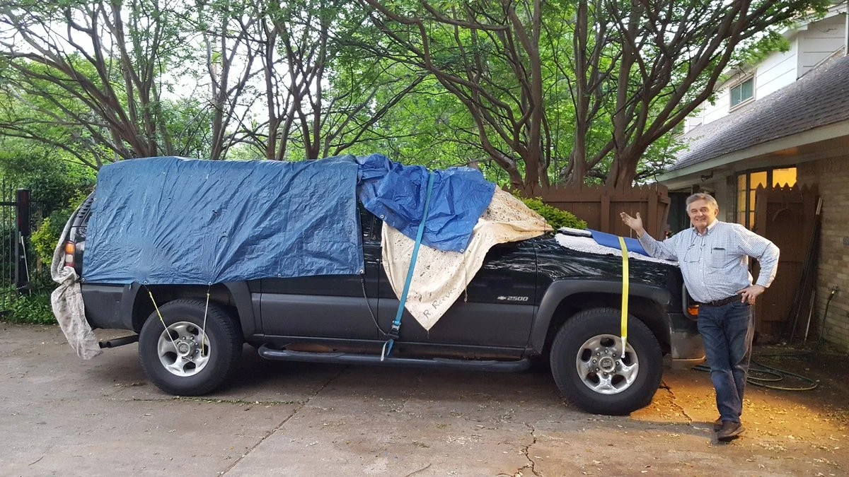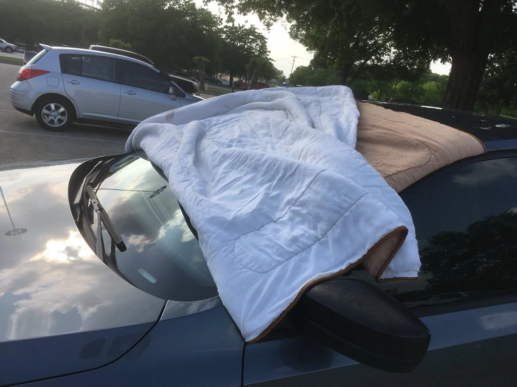 Teksas Eyaleti’nde yaşayanlar, şiddetli gök gürültülü fırtınalara ve beysbol topu büyüklüğünde yağacak dolu tehdidine karşı araçlarını bulabildikleri her şeyle kaplayarak korumaya çalıştı.