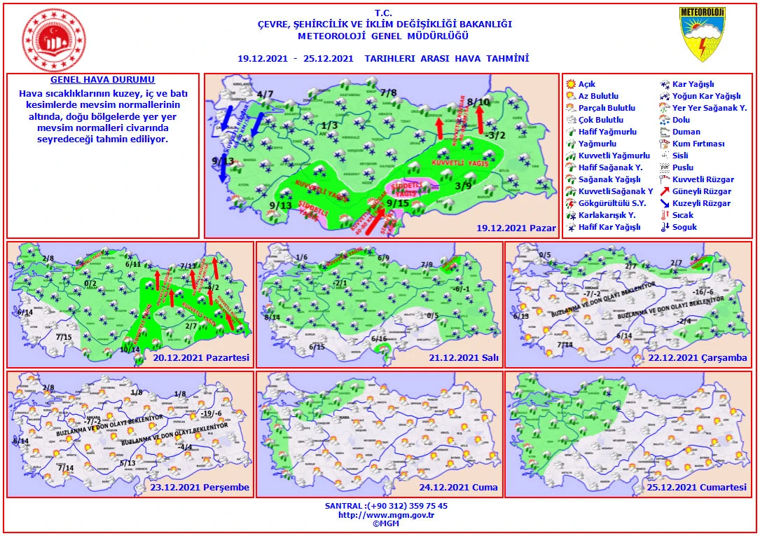 Meteoroloji Genel Müdürlüğü tarafından yapılan son değerlendirmelere göre; Yurt genelinde hava sıcaklıkları mevsim normallerinin altında seyretmeye devam edecek. Marmara'nın batısı dışında kalan tüm yurtta yağış bekleniyor. Kıyı kesimlerde yağmur ve sağanak, iç kesimlerde karla karışık yağmur ve kar şeklinde görülecek yağışların Akdeniz Bölge geneli, Konya'nın güneyi, Karaman çevreleri, Doğu Anadolu'nun batısı ile Güneydoğu Anadolu'nun batısı ve kuzeyinde kuvvetli olacağı tahmin ediliyor.