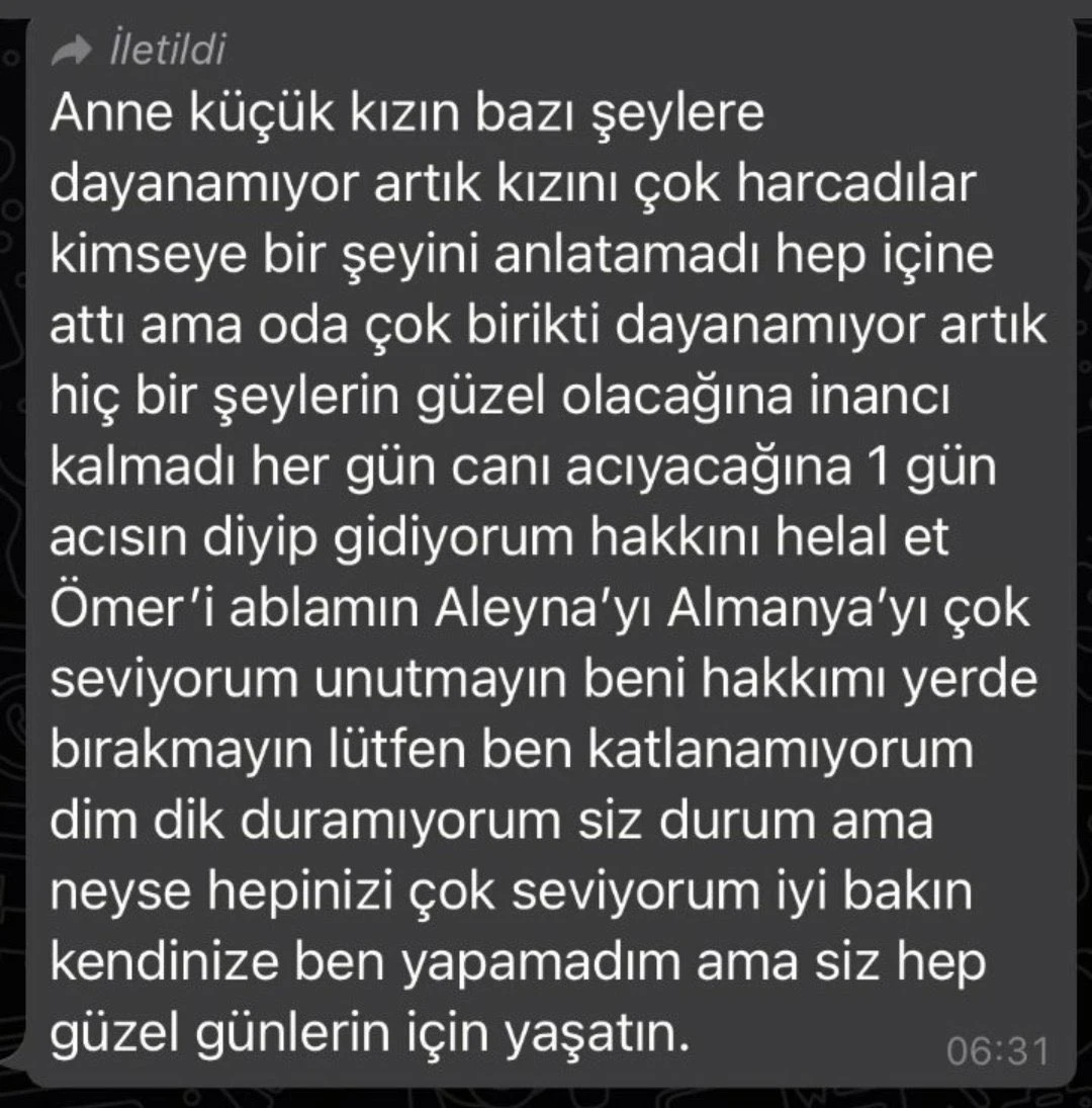 18 yaşındaki Eda Nur, hayatına son vermeden önce annesine yazdığı mesajda, "Anne küçük kızın bazı şeylere dayanamıyor artık. Kızını çok harcadılar. Kimseye bir şeyini anlatamadı. Hakkımı yerde bırakmayın lütfen. Ben katlanamıyorum, dimdik duramıyorum siz durun'' ifadeleri yer aldı.