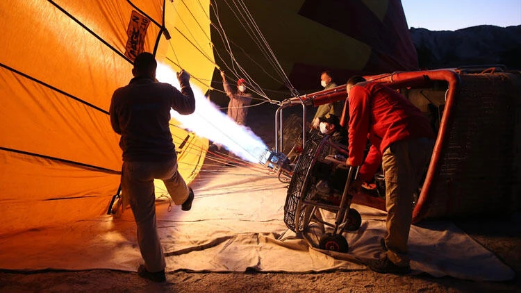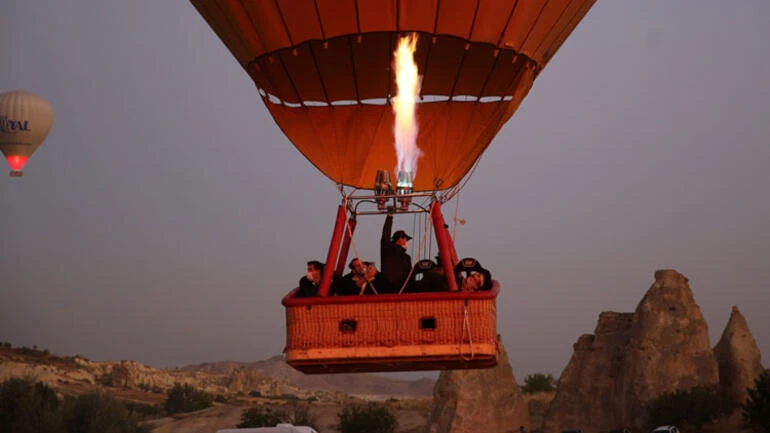 Uçuş için hazırlanan sıcak hava balonu gün doğumu vaktinde gökyüzüne yükselerek, yaklaşık 45 dakika boyunca peribacaları üzerinde süzüldü.