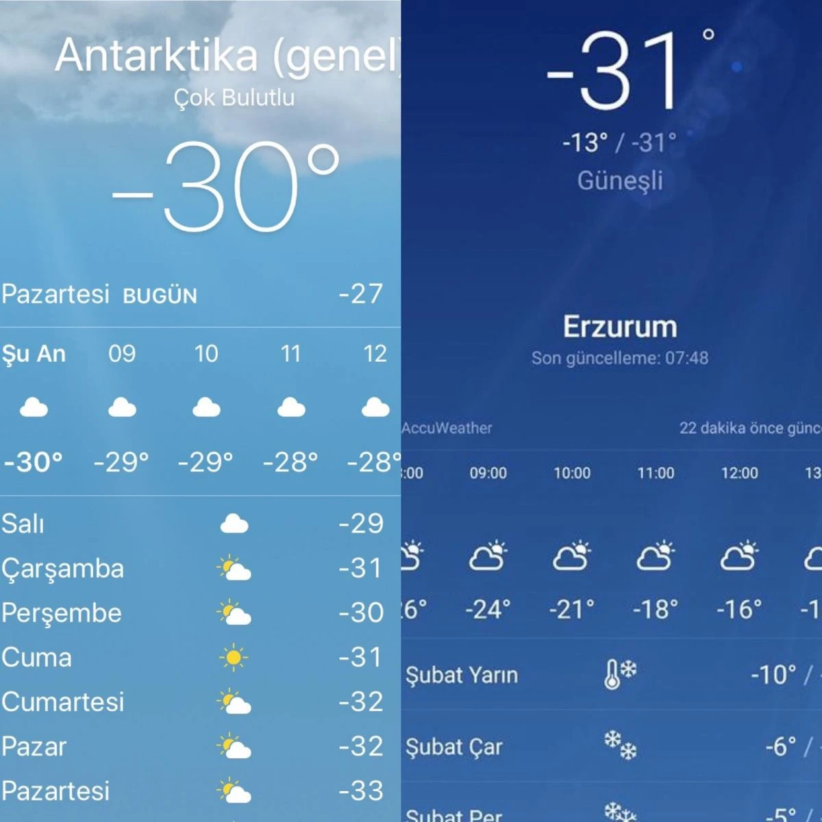 Aşırı soğukların yaşandığı Erzurum, Güney Yarım kürenin en güneyinde bulunan ve Güney Kutbunda yer alan Antarktika’yı geçti. Erzurum’da birçok vatandaş sosyal medya hesabında Erzurum ve Antarktika’yı karşılaştırarak paylaşımda bulundu. Sosyal medyada paylaşılan termometre fotoğraflarında Erzurum’da eksi 31, Antarktika’da da eksi 30 olarak en düşük hava sıcaklığı belirtildi.