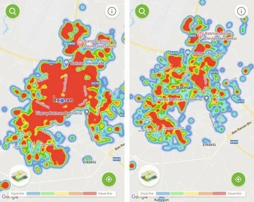 Özellikle normalleşme döneminin başladığı 1 Haziran’dan itibaren tedbirlerin unutulduğu Batman’daki vaka artışı, Sağlık Bakanlığının vakaların bulunduğu bölgeleri gösteren ‘Hayat Eve Sığar’ (HES) uygulamasındaki haritaya da yansıdı. 6 Temmuz ve 8 Ağustos tarihlerinde alınan iki harita görüntüsü, durumun ciddiyetini gözler önüne serdi. Son 1 aylık sürede Batman haritasının neredeyse tamamı ‘kırmızı’ denge büründü.