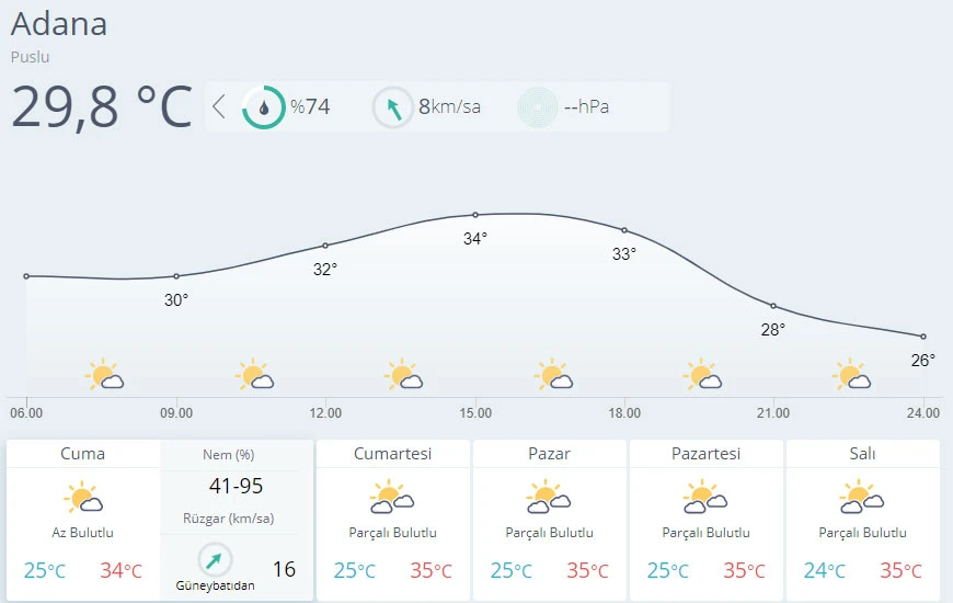 Adana: Az bulutlu ve açık, yarın kuzey kesimleri yerel olmak üzere sağanak ve gök gürültülü sağanak yağışlı 34