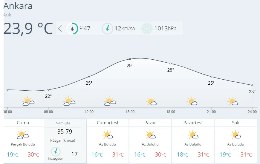 Ankara: Parçalı zamanla çok bulutlu, öğle saatlerinden sonra kuzey ve batı kesimleri yerel olmak üzere sağanak ve gök gürültülü sağanak yağışlı 30