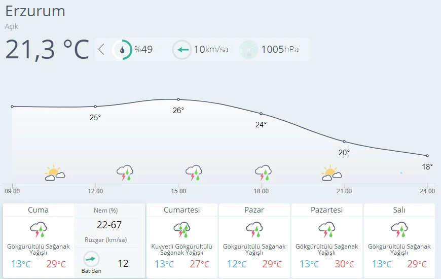 Erzurum: Parçalı ve çok bulutlu, öğle saatlerinden sonra kuzeyi yerel olarak kuvvetli sağanak ve gök gürültülü sağanak yağışlı 29