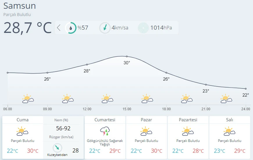 Samsun: Parçalı bulutlu, öğle saatlerinden sonra doğusu yerel olmak üzere sağanak yağışlı 30