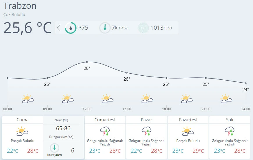 Trabzon: Parçalı bulutlu, zamanla iç kesimleri yerel olmak üzere sağanak ve gök gürültülü sağanak yağışlı 28