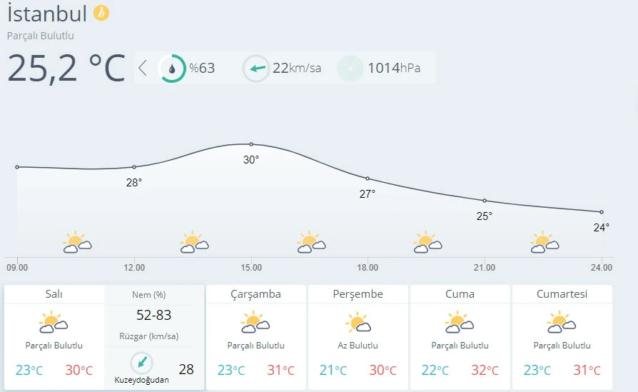 Yapılan son değerlendirmelere göre, yurdun doğu kesimlerinin parçalı ve yer yer çok bulutlu; Orta Karadeniz kıyıları, Doğu Karadeniz, Doğu Anadolu'nun kuzeyi, Tokat, Osmaniye, Van'ın kuzeyi ve doğusu ile Hatay'ın kıyı kesimlerinin yerel olmak üzere sağanak ve gök gürültülü sağanak yağışlı, diğer yerlerin az bulutlu ve açık geçeceği tahmin ediliyor. Güneydoğu Anadolu'nun güney ve doğusu ile Doğu Anadolu'nun güneydoğusunda toz taşınımı bekleniyor.