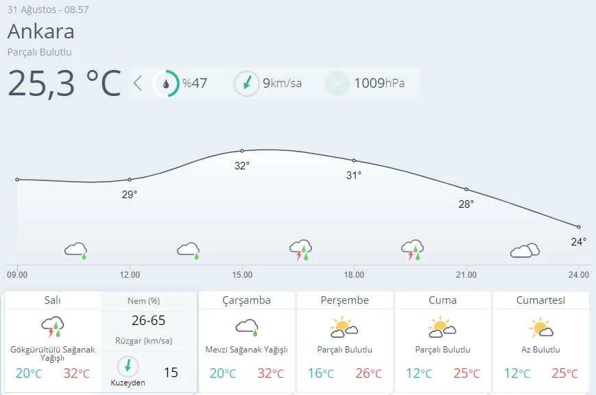 Ankara: Parçalı ve çok bulutlu, öğle saatlerinden sonra yerel sağanak ve gök gürültülü sağanak yağışlı 32