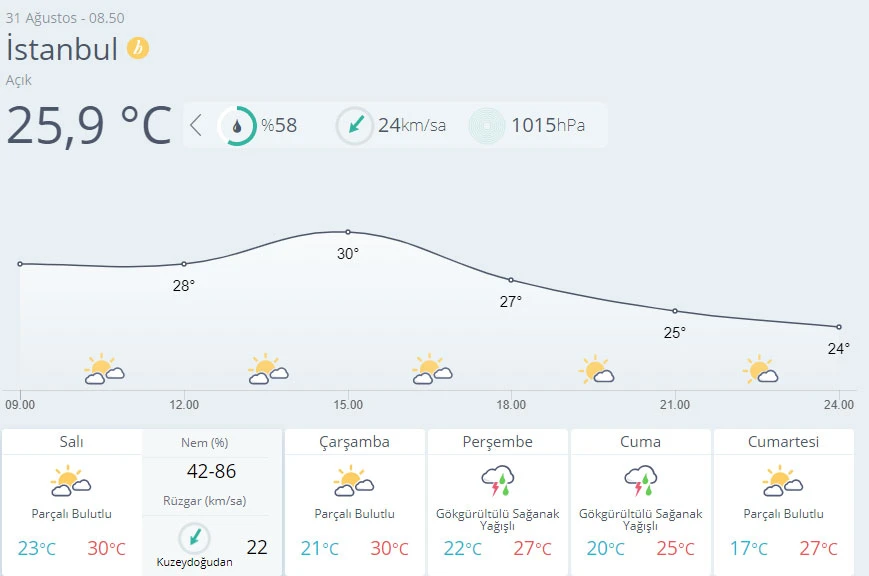 Yapılan son değerlendirmelere göre, yurdun kuzey ve iç kesimleri ile Akdeniz’in iç kesimlerinin parçalı, yer yer çok bulutlu, Marmara’nın doğusu, Batı Karadeniz, Doğu Karadeniz kıyıları, Batı Akdeniz'in Toroslar mevkii, Afyonkarahisar, Eskişehir ve Samsun'un doğu, Konya'nın batı çevreleri ile Isparta, Ankara, Çankırı ve Ordu çevrelerinin yerel sağanak ve gök gürültülü sağanak yağışlı, diğer yerlerin az bulutlu ve açık geçeceği tahmin ediliyor.