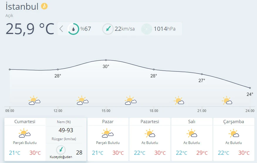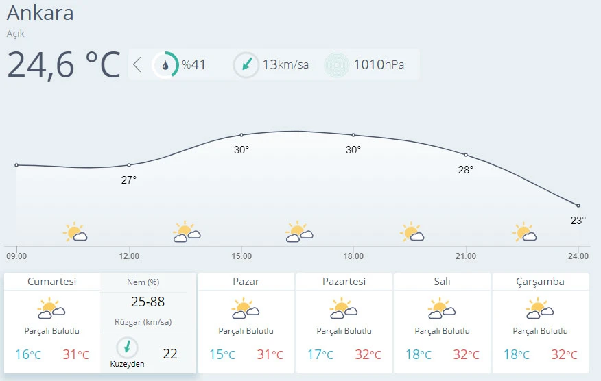 Meteoroloji Genel Müdürlüğü tarafından yapılan son değerlendirmelere göre, yurdun kuzey kesimlerinin parçalı yer yer çok bulutlu, Orta Karadeniz kıyıları, Doğu Karadeniz, Tokat, Sivas, Erzincan, Erzurum, Kars, Ardahan, Iğdır ve Ağrı'nın kuzeyi ile Sakarya, Düzce, Bolu ve Karabük çevrelerinin yerel olmak üzere sağanak ve gök gürültülü sağanak yağışlı, diğer yerlerin az bulutlu ve açık geçeceği tahmin ediliyor.