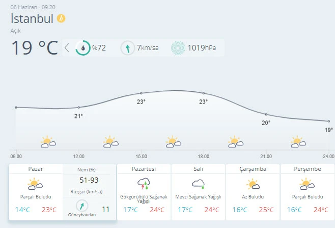 Meteoroloji Genel Müdürlüğü tarafından yapılan son değerlendirmelere göre, yurdun kuzey kesimlerinin parçalı, yer yer çok bulutlu, Doğu Karadeniz, Doğu Anadolu'nun kuzeyi ve Tokat çevreleri ile Ordu'nun iç kesimlerinin yerel olmak üzere sağanak ve gök gürültülü sağanak yağışlı, diğer yerlerin az bulutlu ve açık geçeceği tahmin ediliyor.