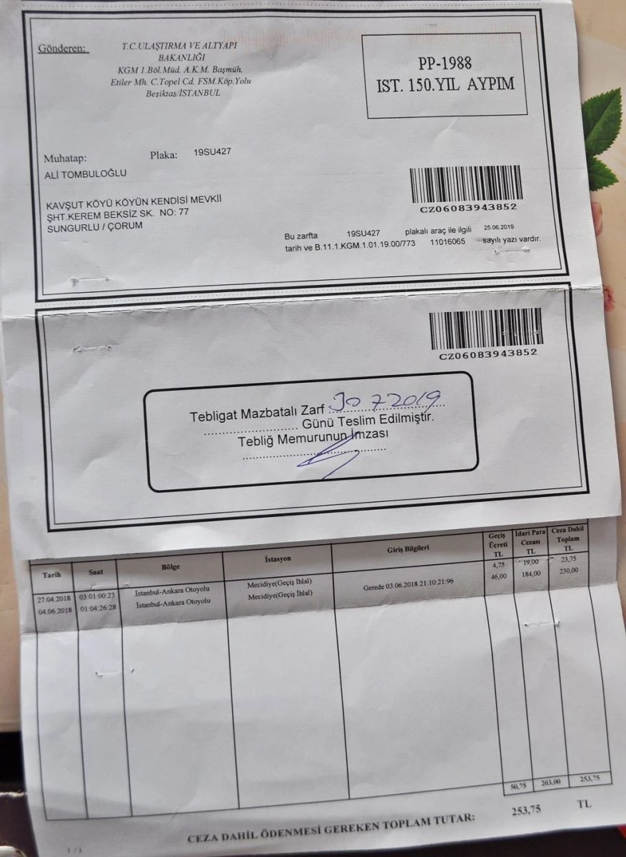 Çorum’un Sungurlu ilçesi Kavşut köyünde çiftçilikle uğraşan Ali Tombuloğlu, 1998 model olan ve kendisinin tarla sürme ve yük taşımada kullandığı 19 SU 427 plakalı traktörüne 27 Nisan 2018 ve 4 Haziran 2018 tarihlerinde İstanbul-Ankara otoyolu Gerede Gişesi'nden kaçak geçiş yaptığına dair para cezası yazılması üzerine şaşkına döndü.