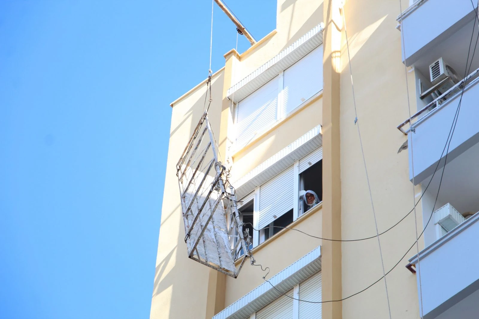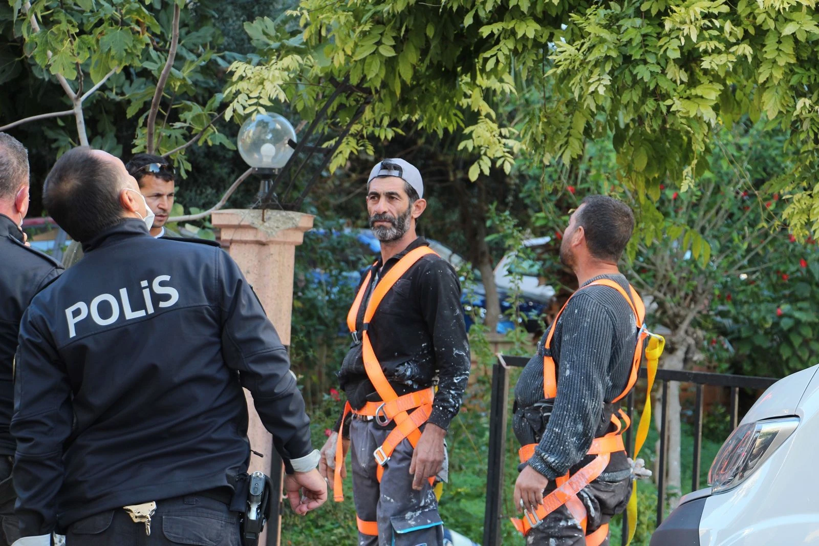 İhbar üzerine bölgeye itfaiye ve polis ekipleri sevk edilirken, emniyet kemerleri takılı iki işçi iskelede korku dolu anlar yaşadı. Ömer Kodak isimli vatandaş diğer motorun fişini çekti ve komşularının yardımıyla iki işçiyi pencereden eve aldı.
