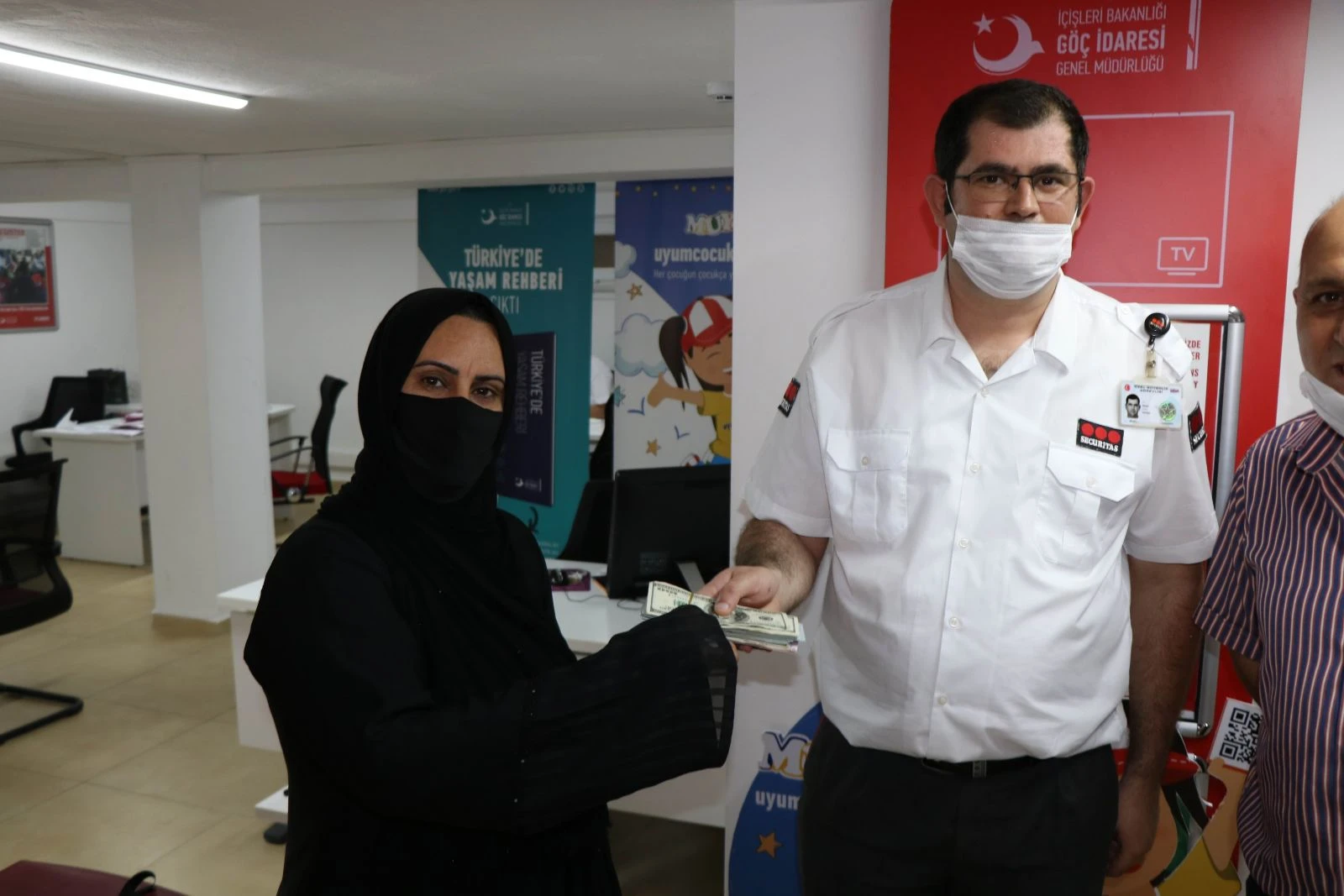 Çantayı kamera önünde kontrol eden Poyraz, çantada 85 adet 100 ABD doları, 185 adet 200 TL ve 20 adet de 50 TL olduğunu gördü. Para ve çantayı kurumdaki idari işler müdürlüğüne teslim etti. Birkaç saat sonra İl Göç İdaresi’ne gelerek çantasını kaybettiğini söyleyen Irak uyruklu Asmaa Mosleh Khalaf Al Obaidi (43), paralarının olduğu çantanın burada olduğunu öğrenince çok sevindi.