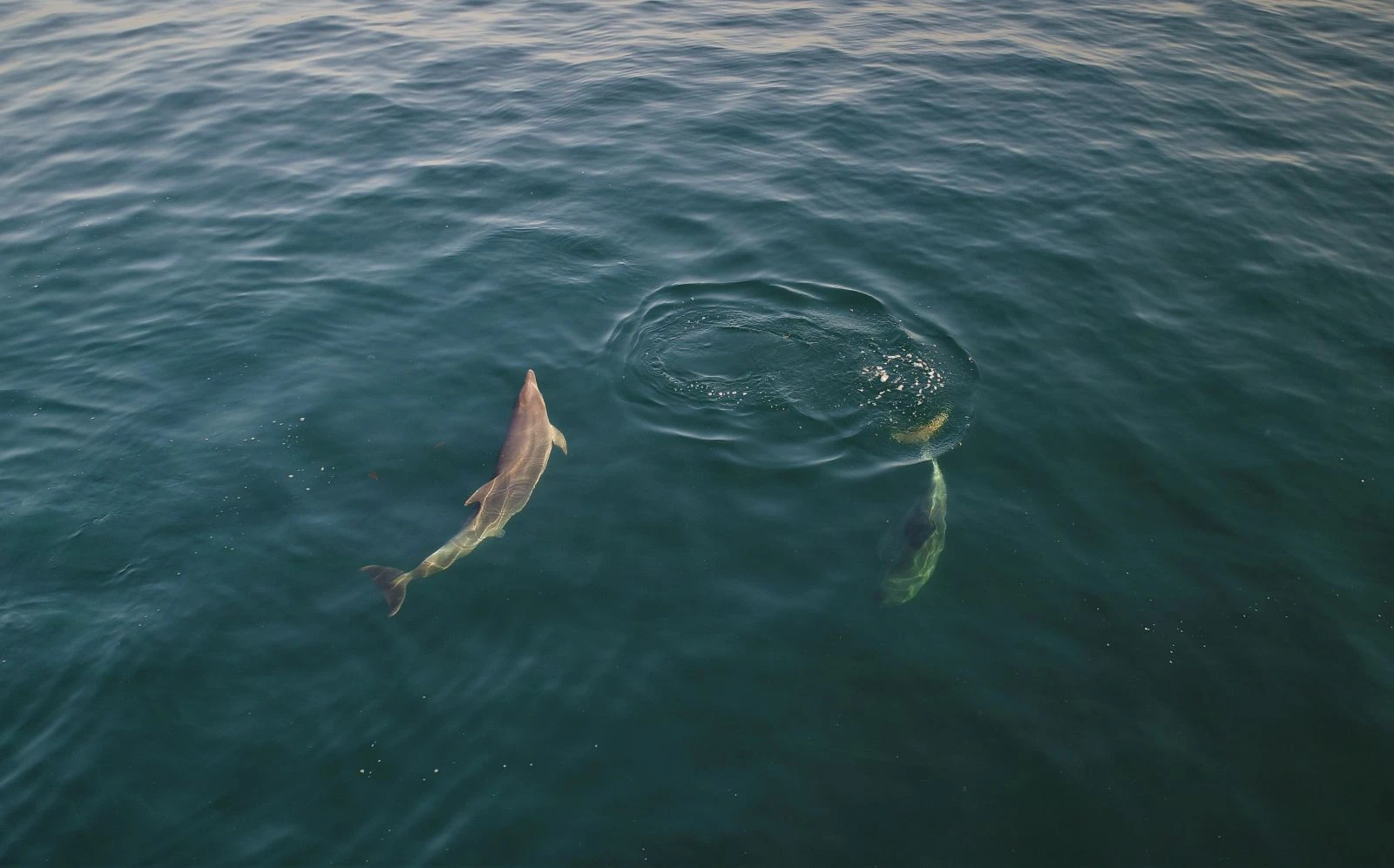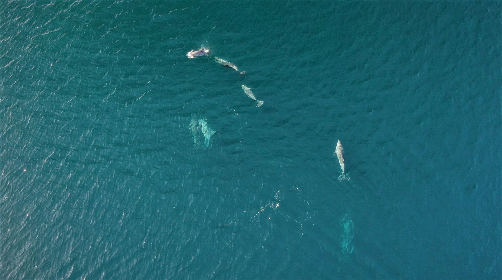 Havadan görüntülenen yunus sürüsünde annesinin yanından ayrılmayan yavru yunusların görüntüsü izleyenlerin içini ısıtıyor.