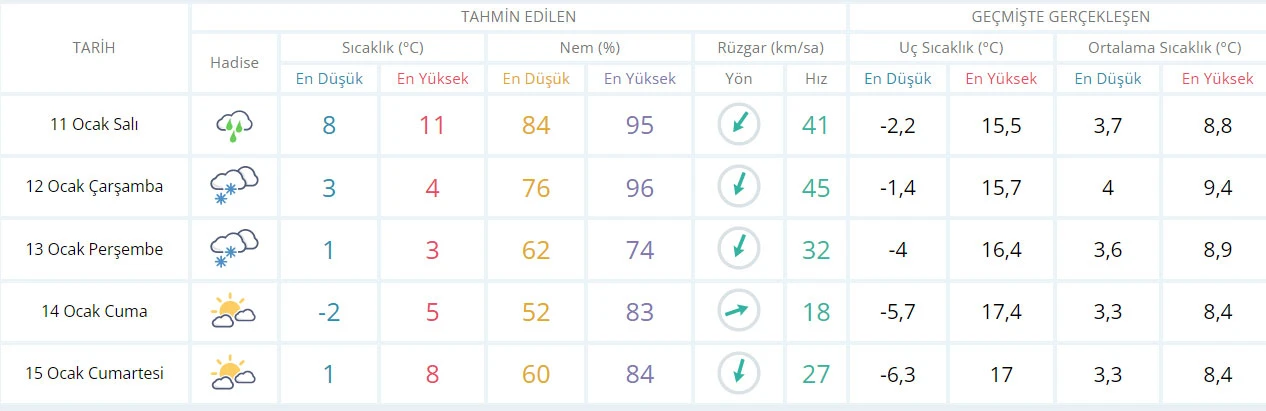 Genellikle yağmur ve sağanak, Kıyı Ege ile Batı Akdeniz kıyılarında yer yer gök gürültülü sağanak, Akdeniz'in Toroslar Mevkiinin yüksekleri, Doğu Anadolu'nun kuzeybatısı ile gece saatlerinden itibaren Trakya'da karla karışık yağmur ve kar şeklinde olması bekleniyor.