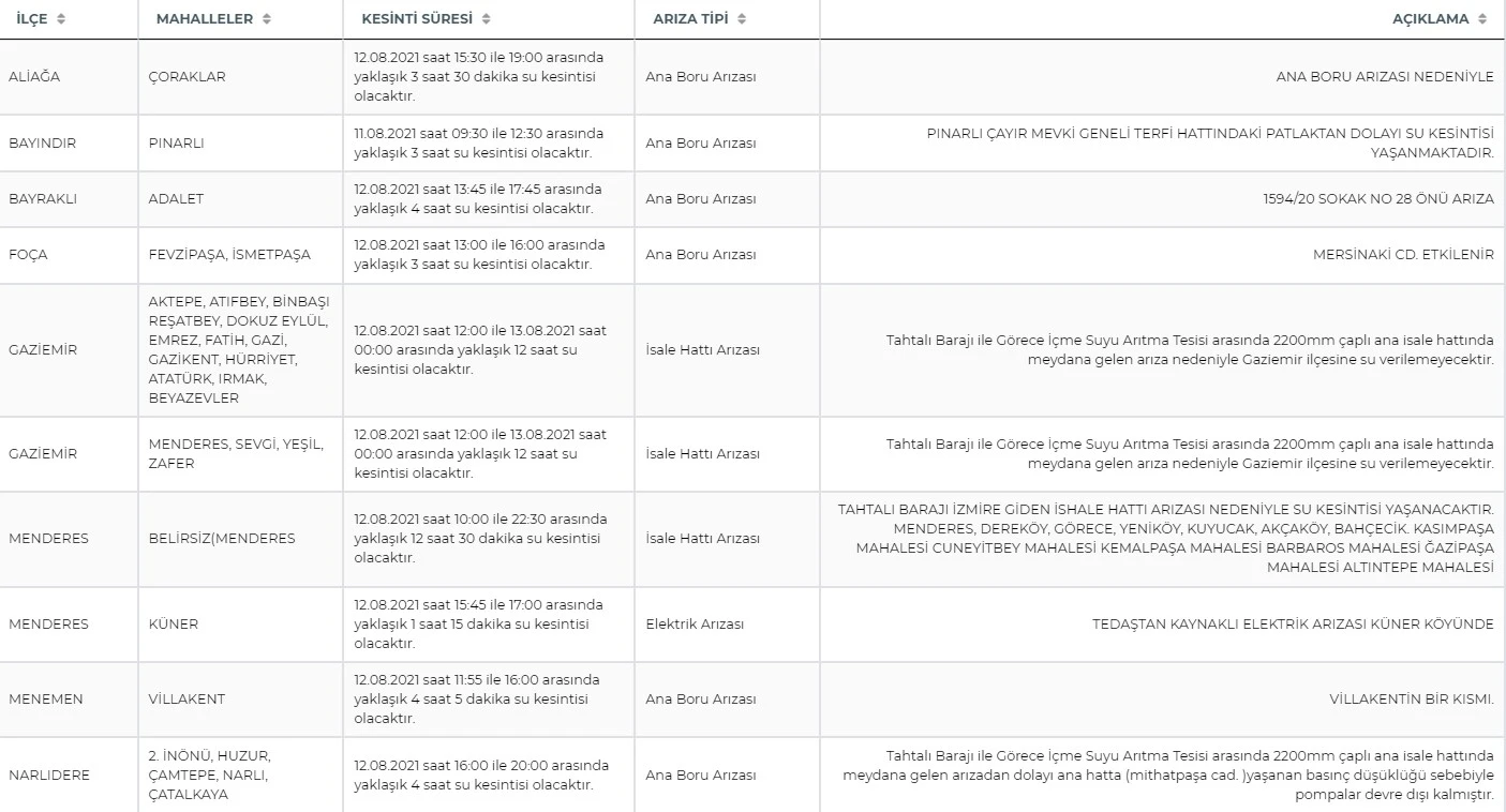 Açıklamada, arızanın tamir edilebilmesi için ise Gaziemir ilçesinde 13.08.2021 tarihi saat 00.00’a kadar su kesintisi yapma zorunluluğu olduğu ifade edildi.