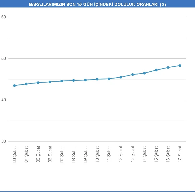 Barajların her geçen gün artan doluluk oranı İSKİ verilerine de yansıdı. 8 Ocak günü yüzde 19.16 seviyesine kadar düşen barajların doluluk oranı bugün itibariyle yüzde 48.28 seviyesine çıktı. Bu oran son 5 ayın zirvesi olarak açıklandı. Diğer taraftan barajların doluluk oranı ay bazında yükselişe geçse de bu oran 6 yılın en düşük doluluk oranı olarak kayda geçti.