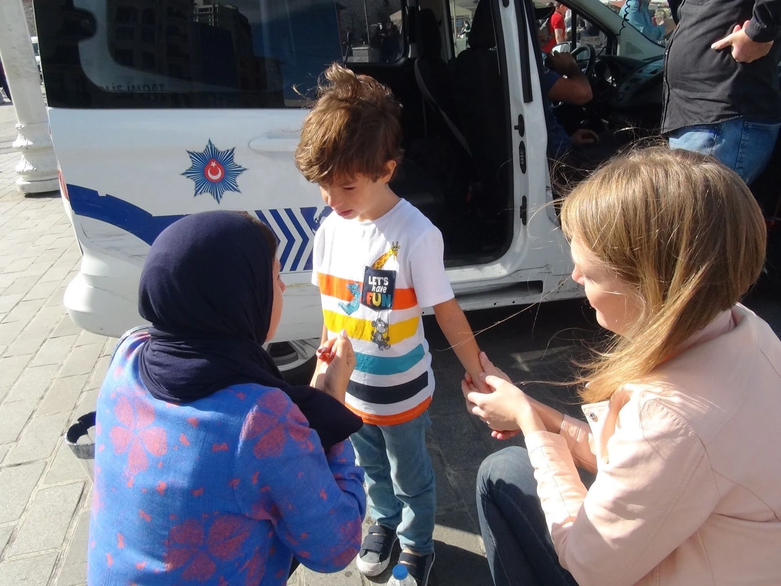 İstiklal Caddesinde ağlarken gördüğü 4 yaşındaki yabancı uyruklu çocuğu polis noktasına götüren turist kadın, onunla adeta öz annesiymiş gibi ilgilendi, bir an olsun çocuğun elini bırakmadı. Meydanda bulunan ekip aracına bindirilen çocuğa polislerce bisküvi, kek ve su verildi.