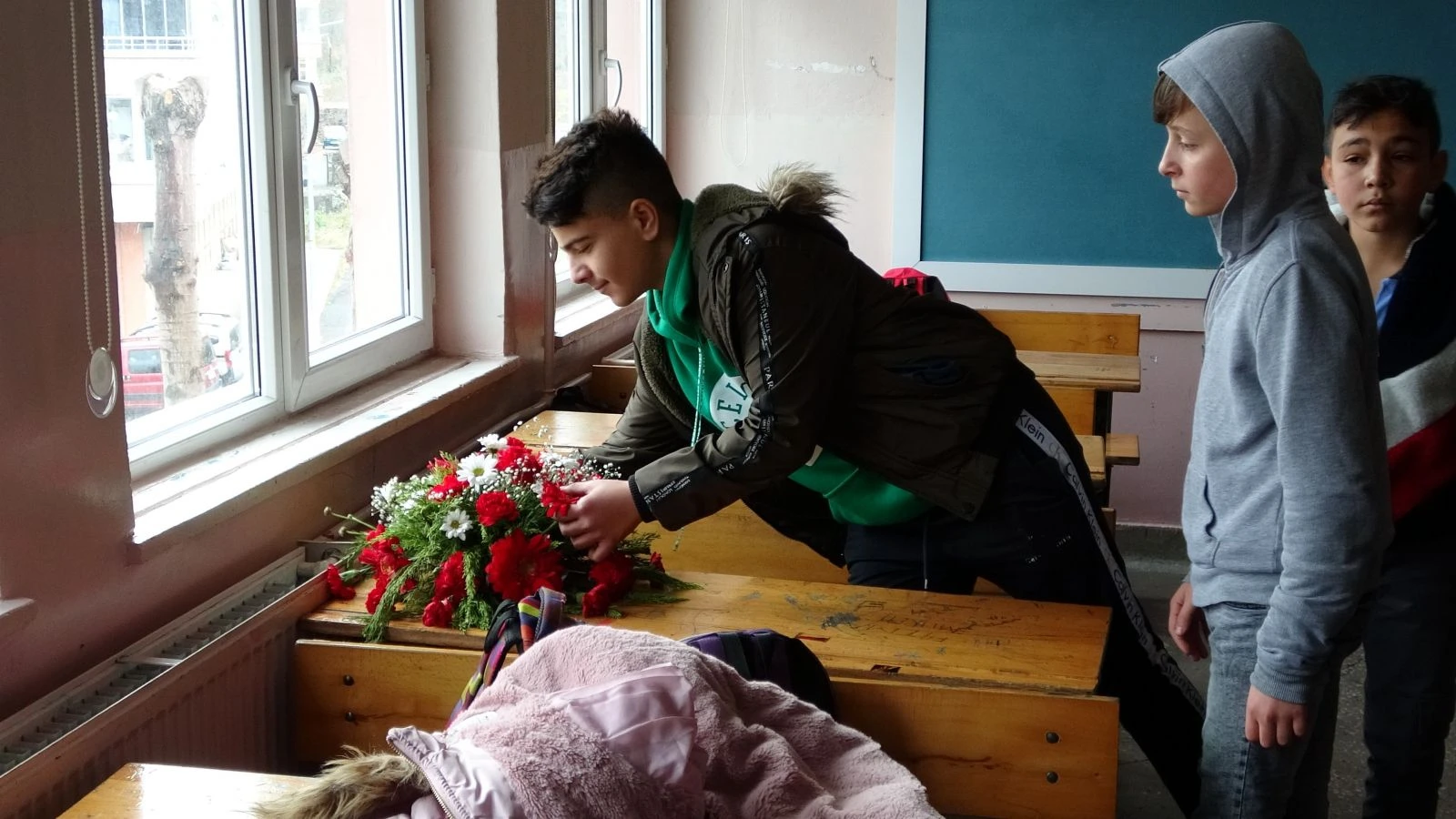 Öğrenciler, arkadaşları için dua ederken sıralarına ise çiçek koymayı da ihmal etmedi.