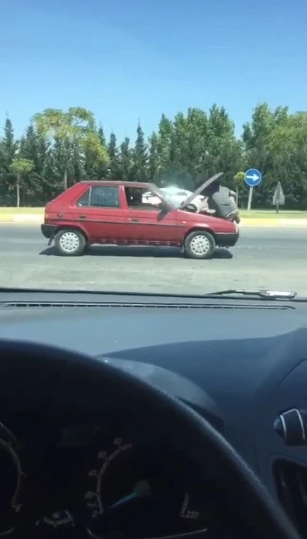 Antalya’nın işlek bir caddesinde gerçekleşen olayda bir kişi aracın kaputunu açıp motor bölümüne oturdu.