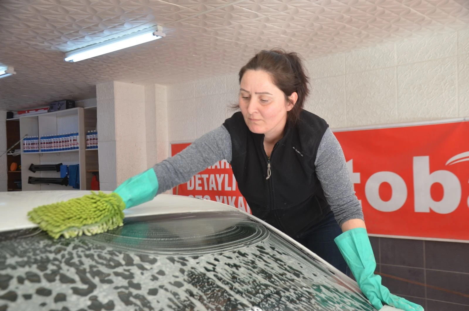 Bursa'nın merkez Nilüfer ilçesinde kurulan oto yıkama dükkanında sadece Gülden ve Gülgün Menevşe adlı iki kız kardeş çalışıyor.