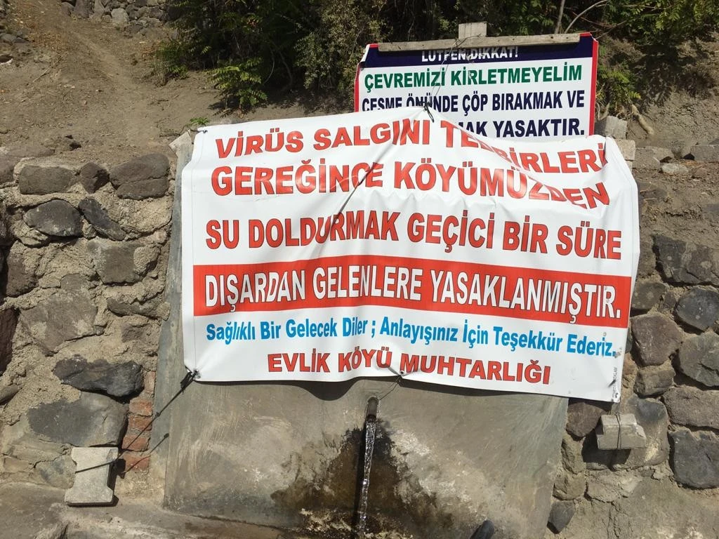 Evlik Köyü Muhtarlığı tarafından hazırlanan ve üzerinde “Virüs salgını tedbirleri gereğince köyümüzden su doldurmak, dışarıdan gelenlere yasaklanmıştır. Sağlıklı bir yaşam diler, anlayışınız için teşekkür ederiz. Evlik Köyü Muhtarlığı” yazılı afiş köy çeşmesi başına asıldı. İçme suyu temin etmek için çeşme başına gelenler ise karşılaştıkları manzara karşısında şaşkınlık yaşadı.