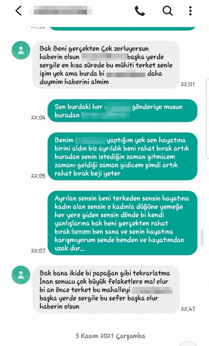 En son ise eski sevgilisi tarafından zorla alı konulduğunu belirten M:K., “Yaklaşık 3 hafta önce muhtarlar yemeği düzenledi ve bir azası ile beni de programa davet etti. Başıma daha çok bela olmasın, çevremdekileri daha fazla rahatsız etmesin diye yemeğe gitmek zorunda kaldım. Oradan çıktığımızda ise kolumdan tutup beni zorla arabasına bindirdi. Issız bir yere götürdü, kimse yoktu yardım isteyemedim. Kapıları kilitledi ve silahını çıkardı. O gece benim ölüm çıkacak diye çok korktum. Bana tehditler savurmaya başladı.’ Buralardan gideceksin, kimse ile görüşmeyeceksin, seni herkese rezil edeceğim’ dedi. Elinde bana ait uygunsuz resimler var ve onları aileme, eski eşime göstermekle tehdit etti. Karşı koymaya çalıştım ama gücüm yetmedi. Bende suyuna giderek kurtuldum. O anlarda ise aklıma evladım geldi. Çünkü bu adam ruh hastası, bana bir şey yapmasa da çocuğuma bir şey yapar ve yaptırır. Bana da zaten sürekli ‘benim kaybedecek bir şeyim yok, ben kendim yapmam yaptırırım, benim yerime cezaevinde yatacak çok’ diyordu” diyerek yaşadıklarını anlattı.