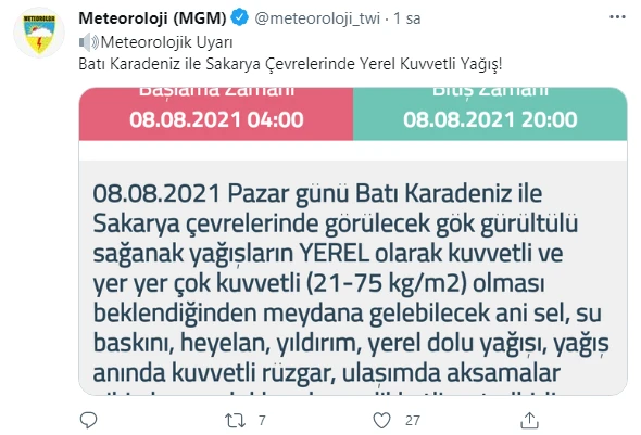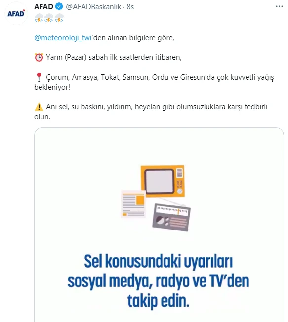 Afet ve Acil Durum Yönetimi Başkanlığı (AFAD) sağanak yağış uyarısında bulundu. AFAD'ın Twitter hesabından yapılan açıklamada şu ifadelere yer verildi;