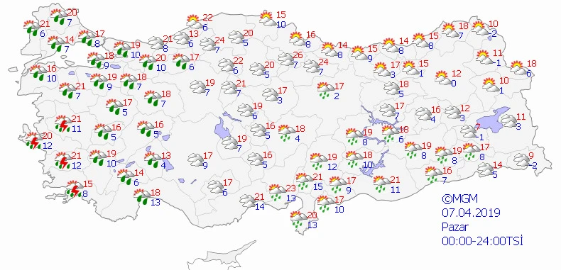 İzmir: Parçalı ve çok bulutlu, öğle saatlerinden sonra kuvvetli olmak üzere aralıklı sağanak ve gök gürültülü sağanak yağışlı 20 derece.
