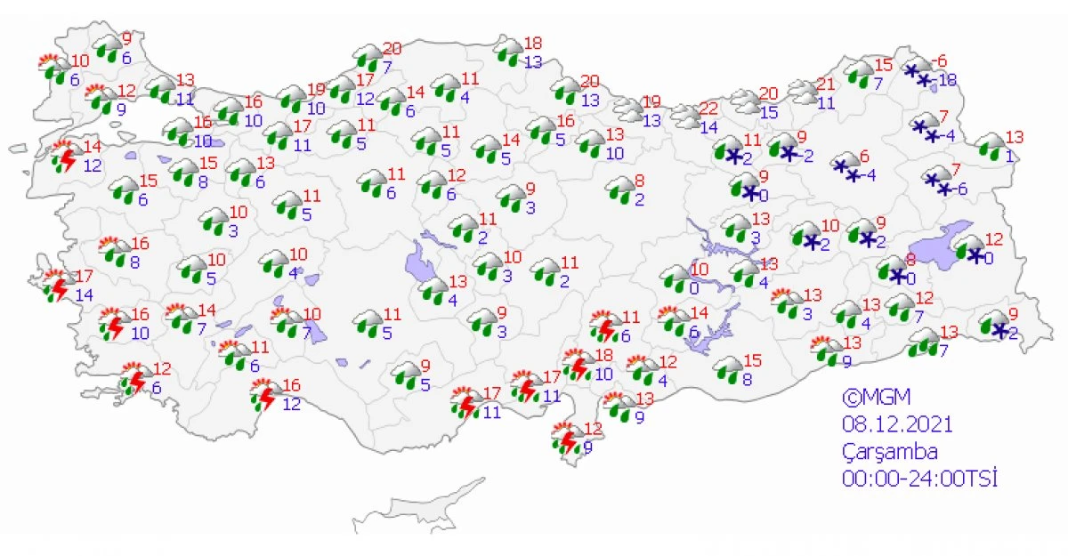 İzmir: Parçalı ve çok bulutlu, sağanak ve gök gürültülü sağanak yağışlı (Yağışların akşam saatlerinden sonra yerel olmak üzere kuvvetli olması bekleniyor) 20