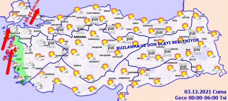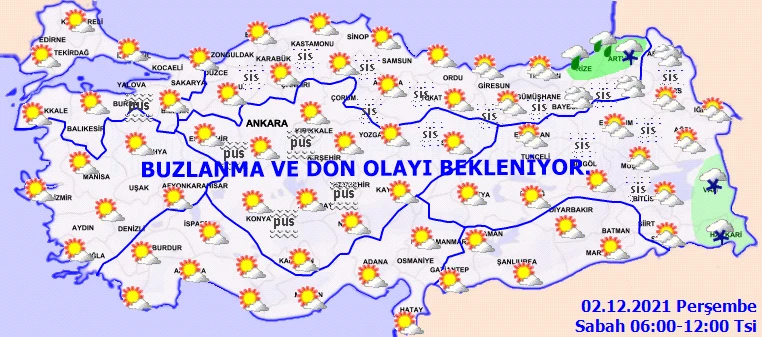 Sabah ve gece saatlerinde Batı Karadeniz'in iç kesimleri ile iç ve doğu kesimlerde buzlanma ve don olayı ile birlikte pus ve yer yer sis bekleniyor.