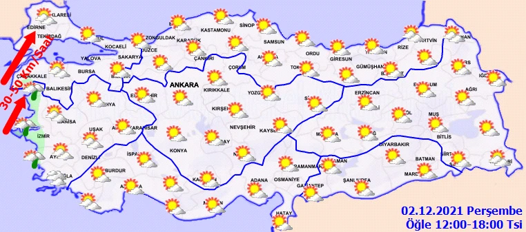 Rüzgar, batı ve kuzey kesimlerde batı ve güneybatı, Doğu ve Güneydoğu Anadolu'da kuzeyli yönlerden hafif, ara sıra orta kuvvette, öğle saatlerinden itibaren Marmara'nın batısı ile Kuzey Ege'de güneybatıdan kuvvetli (30-60 km/saat) olarak esecek.
